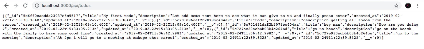 To get all the todos in your database just access this link from your browser. http://localhost:3000/api/todos this will give you a similar json data like this one: