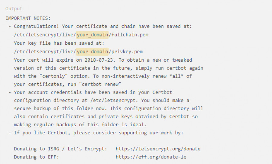 Sélectionnez votre choix puis appuyez sur ENTER. La configuration sera mise à jour et Apache se rechargera pour récupérer les nouveaux paramètres. certbot se terminera par un message vous indiquant que le processus a réussi et où vos certificats sont installés :