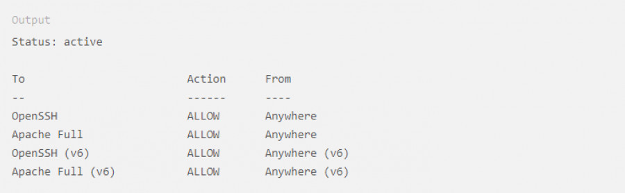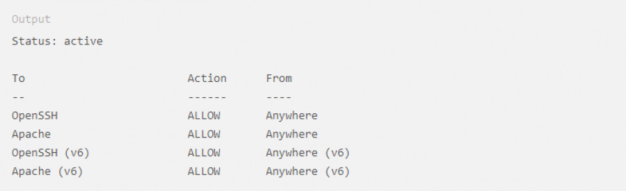 Si vous avez activé le pare-feu ufw, comme recommandé par les guides des prérequis, vous devrez ajuster les paramètres pour autoriser le trafic HTTPS. Heureusement, Apache enregistre quelques profils avec ufw lors de l'installation.