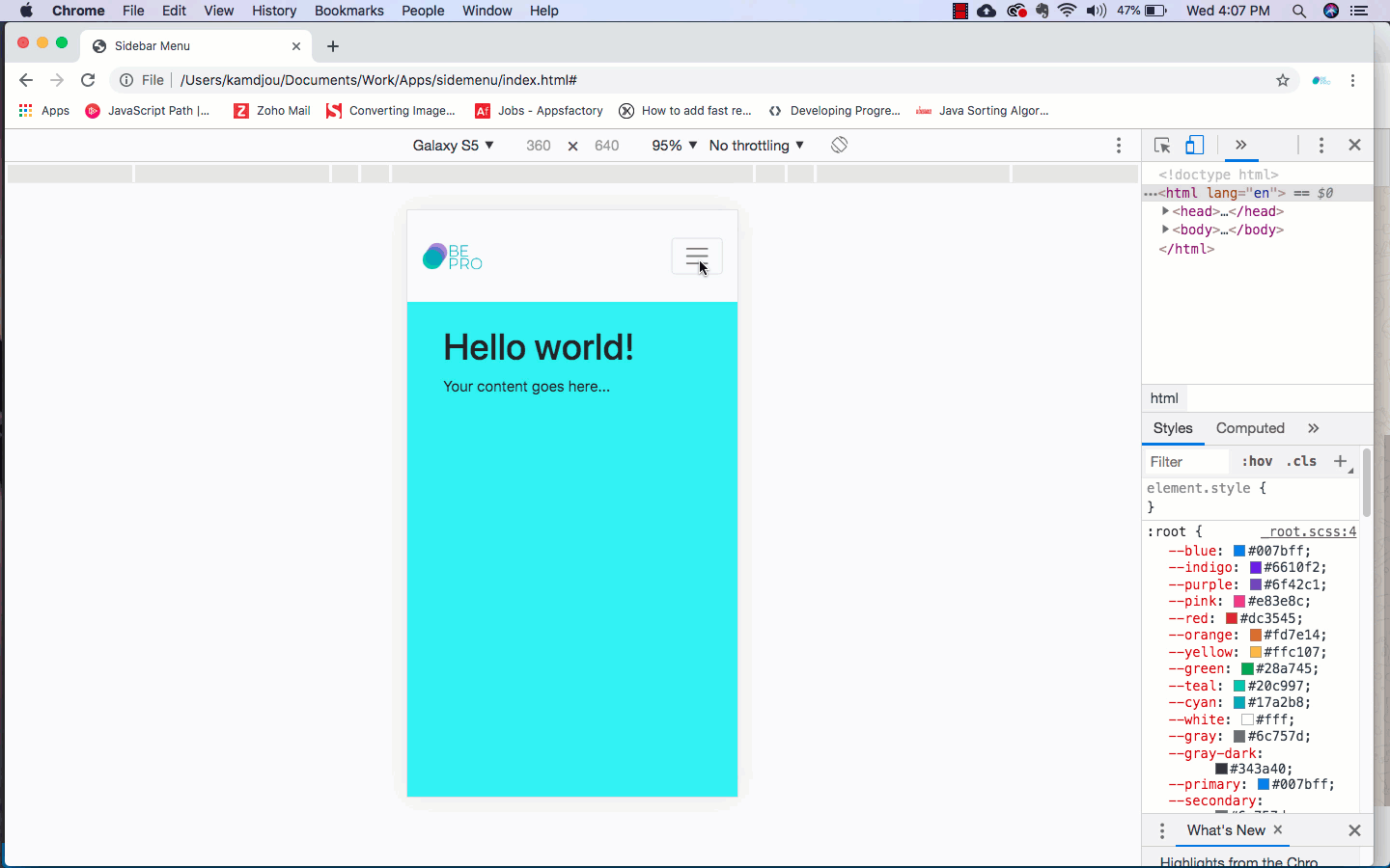 As you may realized, the nav element is from the Bootstrap 4 component. I just added my logo(trademark) there, with the toggle button which is already responsive (adopt on any screen size) and that is all. Following that, we have the div element with the sidebar with other classes  and an id on it to handle the show/hide of the component accordingly. You can see that we just added some simple list (ul) to give it a sense. For the last part, it’s just the content container with a h1 and paragraph on it.